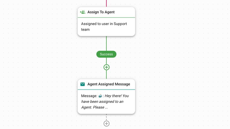 Para ello, tendrá que crear un Paso Asignar a y seguirlo con un Paso Enviar un mensaje. Allí deberá escribir un mensaje que informe a los Contactos que han sido asignados a un Agente. Además, sugerimos incluir el nombre del agente asignado.