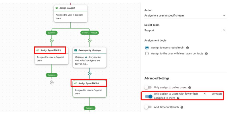 Después de su paso principal Asignar a, habilite una rama de tiempo de espera y redacte su mensaje a continuación. Este mensaje debe incluir una disculpa por la espera, el estado actual de los Agentes y el tiempo de respuesta esperado. A continuación, añada otro Paso Asignar a para asignar el Contacto en cola a un Agente con contactos máximos adicionales.