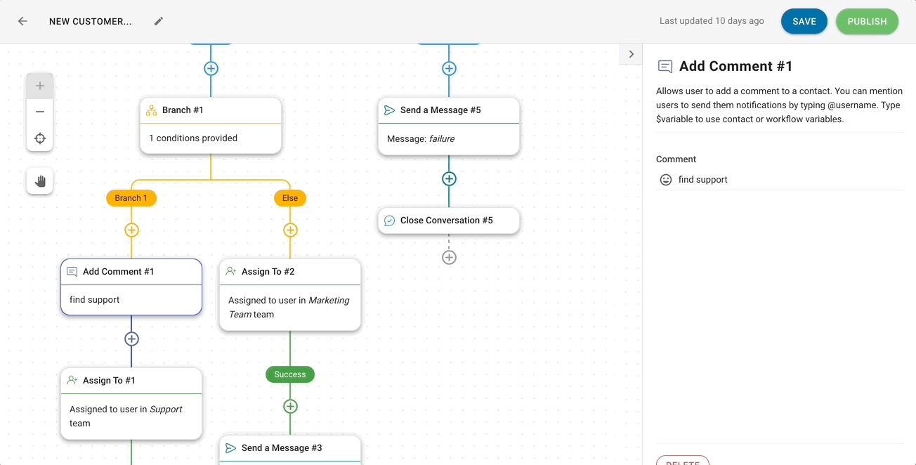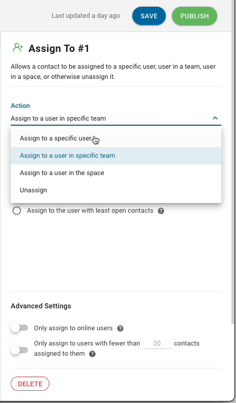 El paso Asignar a, brinda una flexibilidad inigualable para asignar contactos a cualquier persona en el espacio, usuarios específicos e incluso usuarios de equipos específicos: ¡una característica completamente nueva! También puede utilizar condiciones como canales, etiquetas y campos personalizados para eliminar Contactos en diferentes ramas y asignarlos a los usuarios en consecuencia